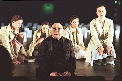 Juliane Koren als Hekabe, hinter ihr der aus vier Schauspielschülerinnen gebildete »Chor kriegsgefangener Troerinnen«.