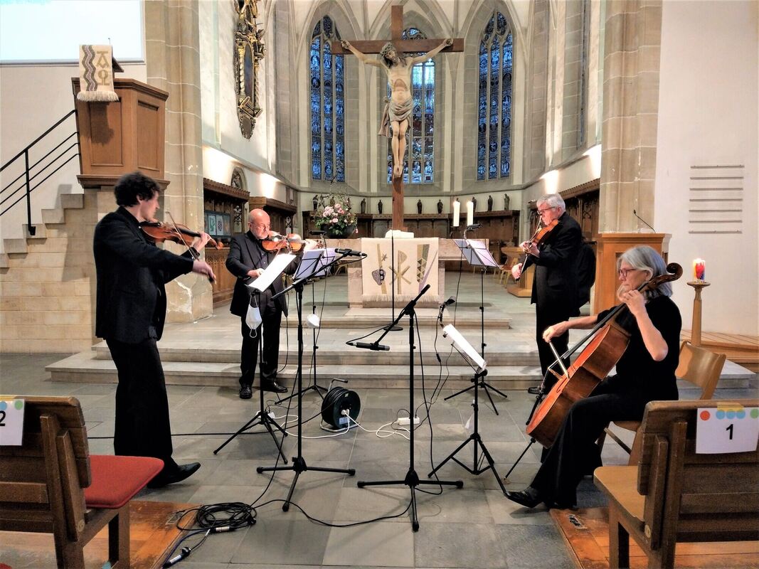 Vier Mitglieder des Martinskollegiums musizieren Haydns Werk in der Pfullinger Martinskirche: von links Stefan Knote, Hans Batsching, Rainer Lachenmann und Angelika Schlenker. FOTO: BÖHM