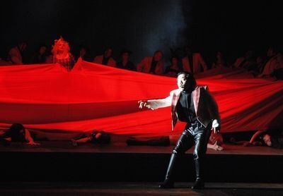 Kwang-Keun Lee (vorne) als Macbeth und Merav Barnea (hinten) als Lady Macbeth in der Ulmer Neuinszenierung von Giuseppe Verdis Oper.