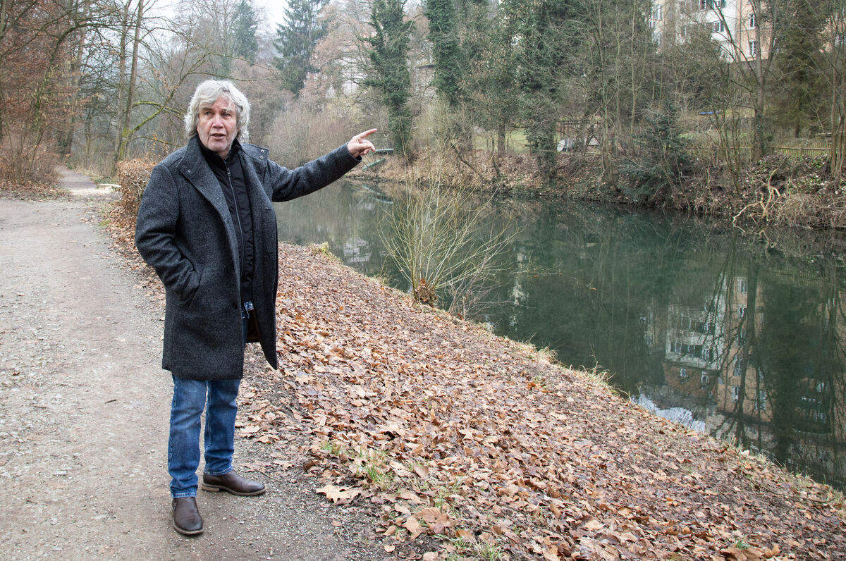 Siegfried Bühr deutet auf den Neckar. Zu sehen ist nichts. Aber Bühr malt Bilder davon, wie es beim Sommertheater sein wird. FOTO: INHOFF
