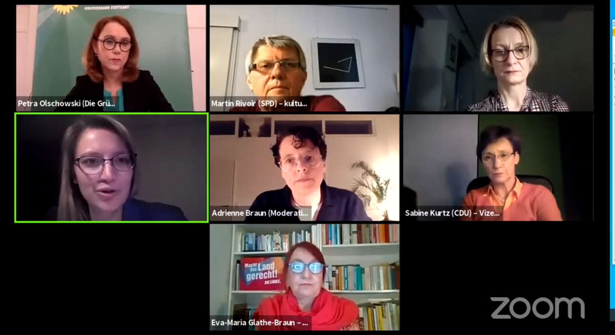 Petra Olschowski, Martin Rivoir, Barbara Neundlinger, Johanna Molitor, Adrienne Braun, Sabine Kurtz und Eva-Maria Glathe-Braun (von oben links) diskutierten. SCREENSHOT: OTT