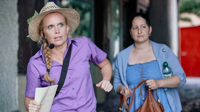 Stefanie Klimkait (links) gibt hier den Gott Dionysos und führt das Publikum in den Hades, sprich die Reutlinger Unterwelt. Ihren im Spitalhof startenden theatralen Spaziergang bietet die Tonne noch bis zum 31. Juli an. FOTO: ARMBUSTER/ TONNE
