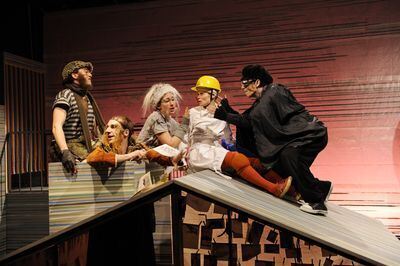 Mit vereinten Kräften und schlauen Ideen versuchen die Katzen das Möwenküken (mit Helm) zum Fliegen zu bringen. Die Darsteller von links: Claudio Schulz-Keune, Christian Beppo Peters, Chrysi Taoussanis, Marie-Louise Gutteck und Rupert Hausner.
