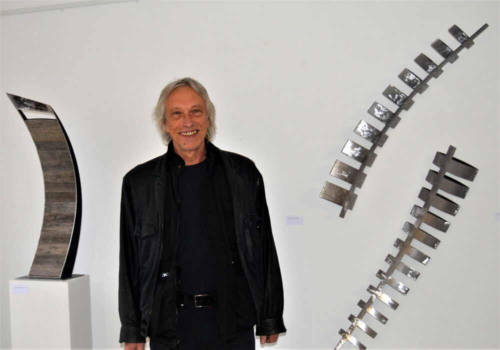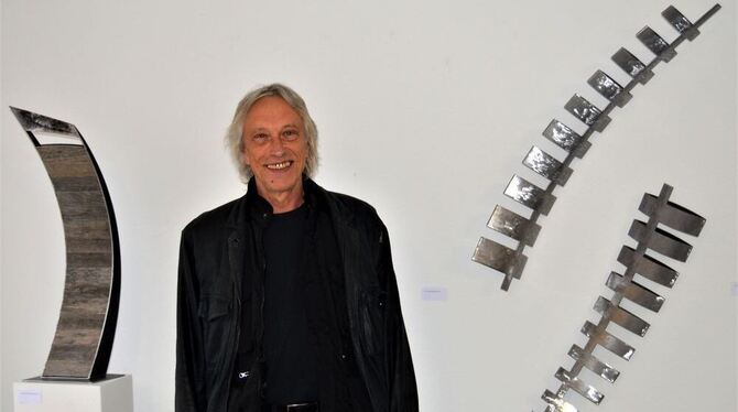 Jochen Warth bei einigen seiner Metall-Skulpturen, die er derzeit in der Galerie Eiting in Pfullingen zeigt. FOTO: VEY