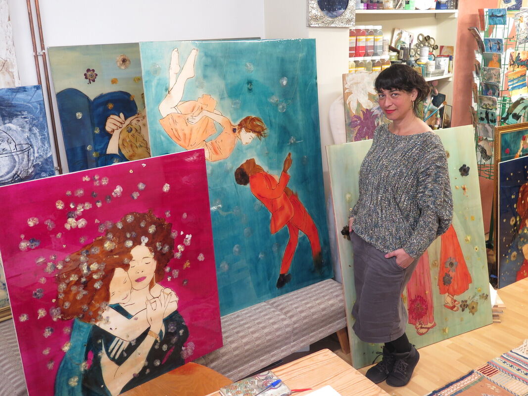 Mehlika Tanriverdi in ihrem Tübinger Atelier in der Ammergasse. Das Bild in der Mitte, »Attraction«, ist eines von zweien, das als großformatiger PVC-Druck an der Hauswand des Reutlinger Kulturzentrums franz.K gezeigt wird. FOTO: STRÖHLE