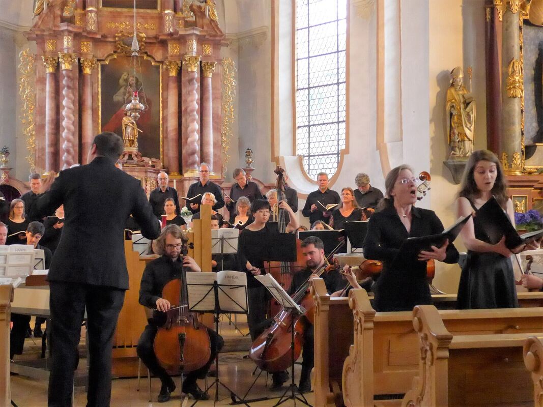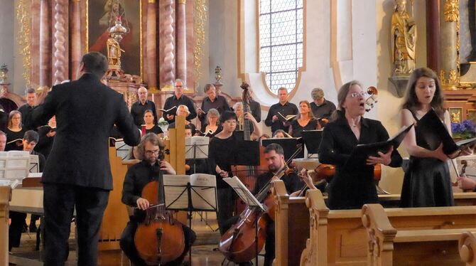 Das von Nikolai Ott geleitete Thomas-Selle-Ensemble und die Sopranistinnen Alexandra Nestel und Julia Hinger in der Kirche St. Martinus in Großengstingen. FOTO: KADEN