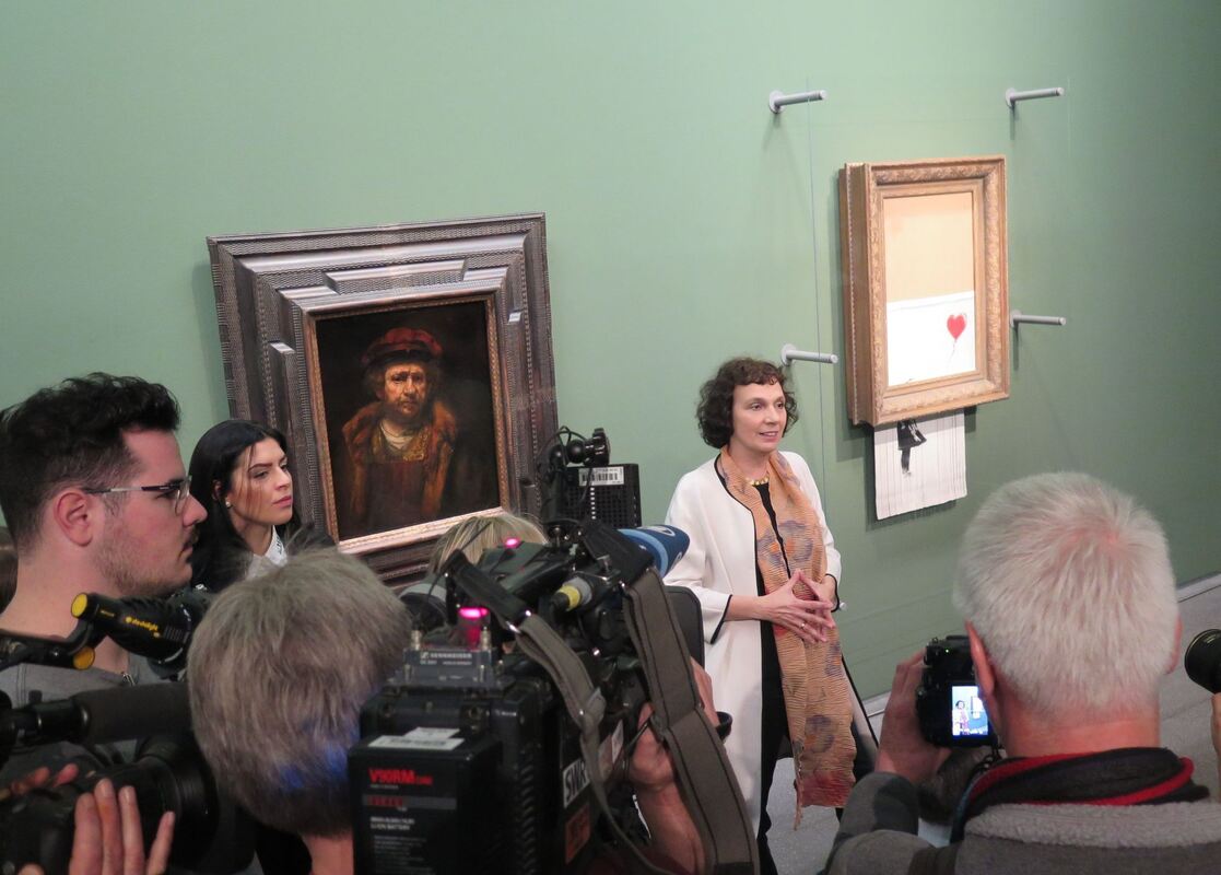 Christiane Lange, Direktorin der Staatsgalerie Stuttgart, erklärt der versammelten Presse, warum das Rembrandt-»Selbstbildnis mit roter Mütze« und Banksys Bild »Love is in the Bin« gut zusammenpassen.
