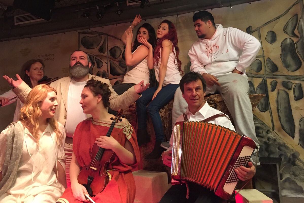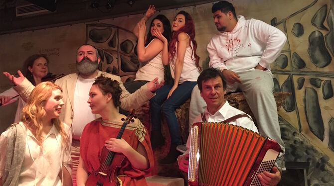 Das Ensemble des Musiktheaters »Orfeo«: vorne von links Sela Bieri als Eurydike und Cornelia Lanz als Orpheus. Hinten Geigerin Esther Schöpf, Ayden Antanyos als Al Mustafa sowie Wissam und Walaa Kanaieh als Amor und Al Mitra. FOTO: STEFANIE SIMBECK