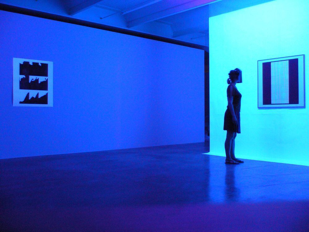 Durch gewisse Schutzhelmfarben kann Schwarzlicht neutralisiert werden – hier mit Arbeiten von Christian Aberle. FOTO: KUNSTVEREIN