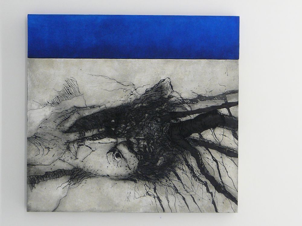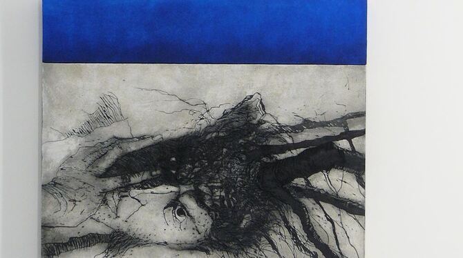 Helmut Anton Zirkelbach: »Vom Rand der Welt: Albtraufbuchen«, ein Werk aus der gegenwärtigen Ausstellung in der Galerie Thron in Reutlingen-Degerschlacht.