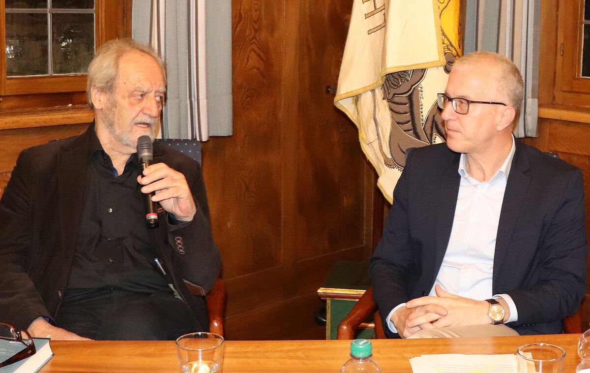 Autor Felix Huby (links) im Gespräch mit Reinhold Weber von der Landeszentrale für politische Bildung Baden-Württemberg. FOTO: BLOCHING
