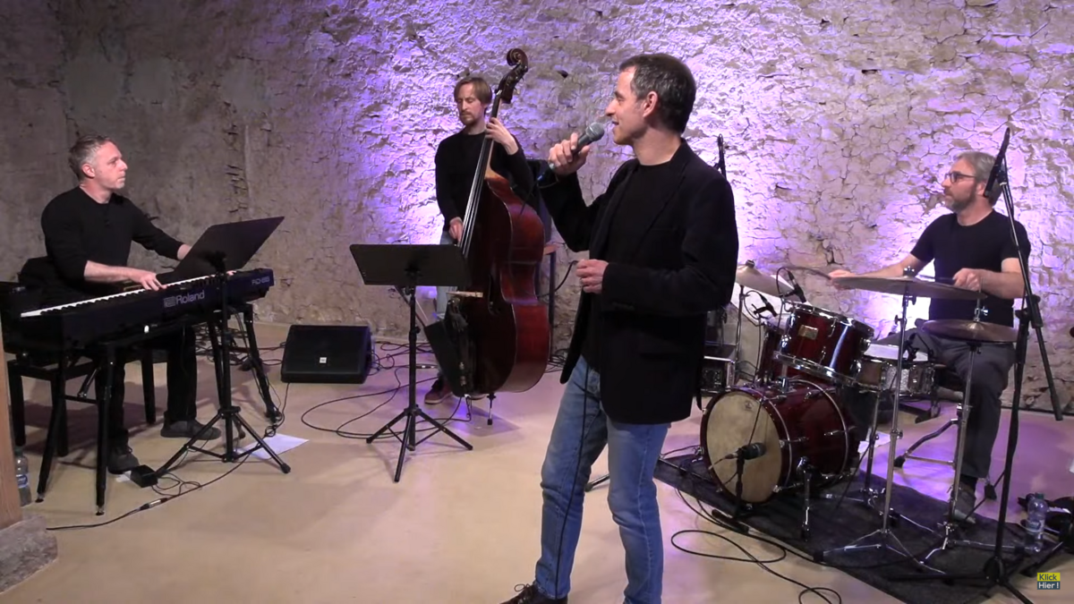 Klangreise durch die Kinowelt: Sänger Habib Benedikt Elias (vorn) mit seinen Mitmusikern (von links) Wolfgang Fischer, Steffen Hollenweger und Joachim Gröschel im Lindenhof. (SCREENSHOT)
