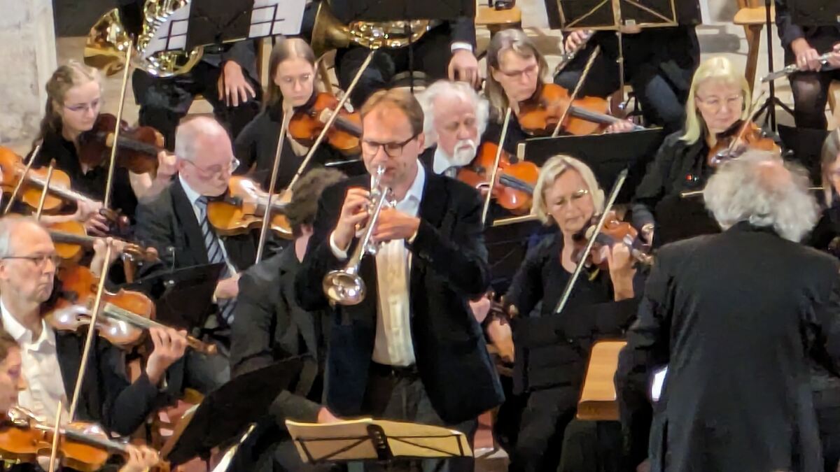 Als zweites Werk stand Joseph Hadyns Konzert für Trompete in Es-Dur auf dem Programm. Als Solist trat Jörge Becker auf, der seit 2009 Solotrompeter des SWR-Symphonieorchesters Stuttgart ist. Das Ärzteorchester, das dieses Jahr sein 40-jähriges Jubiläum feiert, bereitete dem Trompeter eine satte Grundlage, von der aus Becker seine beeindruckenden klanglichen Höhenflüge startete. Ganz besonders an den Stellen, an denen er unbegleitet spielte, ließ er die Stiftskirche mit seinem Spiel erstrahlen. War das Andante von großen und weitgespannten musikalischen Phrasen geprägt, so entzündete sich im dritten Satz ein musikalisches Feuerwerk. Orchester und Solist warfen sich im Allegro die musikalischen Phrasen schnell hin und her, wodurch sie gemeinsam zur Einheit wurden.