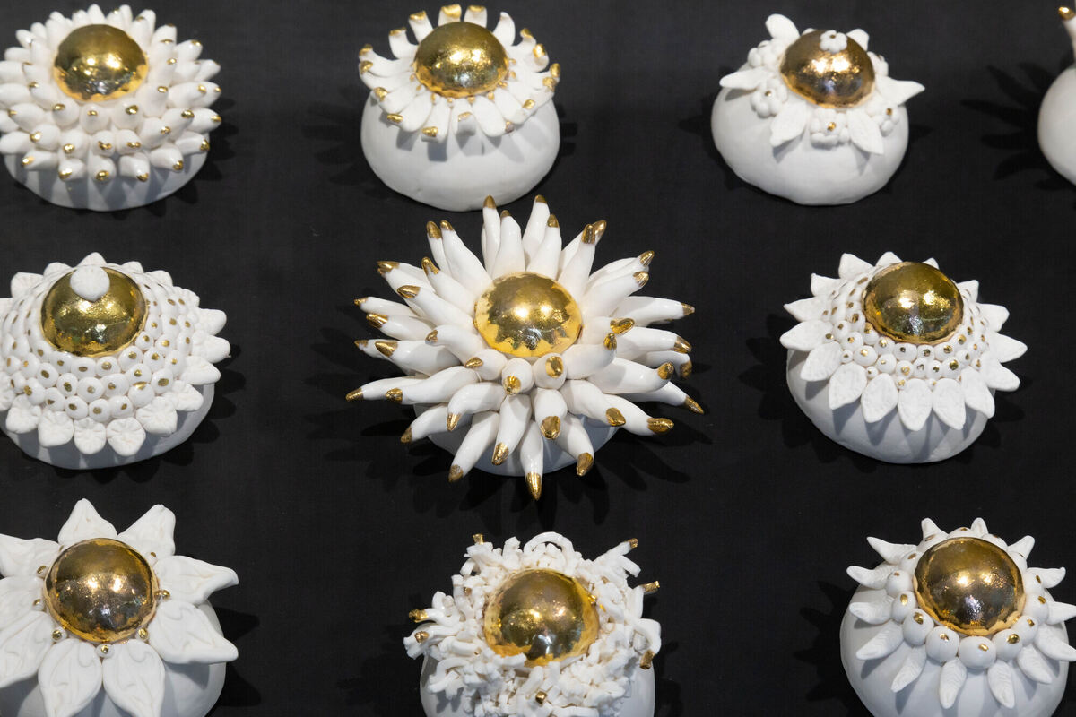 Weiße Keramik-Blüten mit Gold zeigt die Künstlerin Heidi Degenhardt. FOTO: INHOFF
