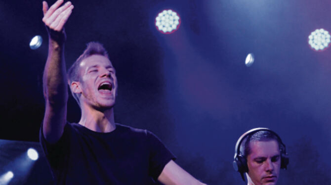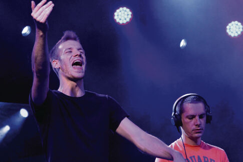 Spike D peitscht die Menge an, Nico Wendel dreht an den Reglern: Das Duo Gestört aber Geil im Echaz-Hafen.