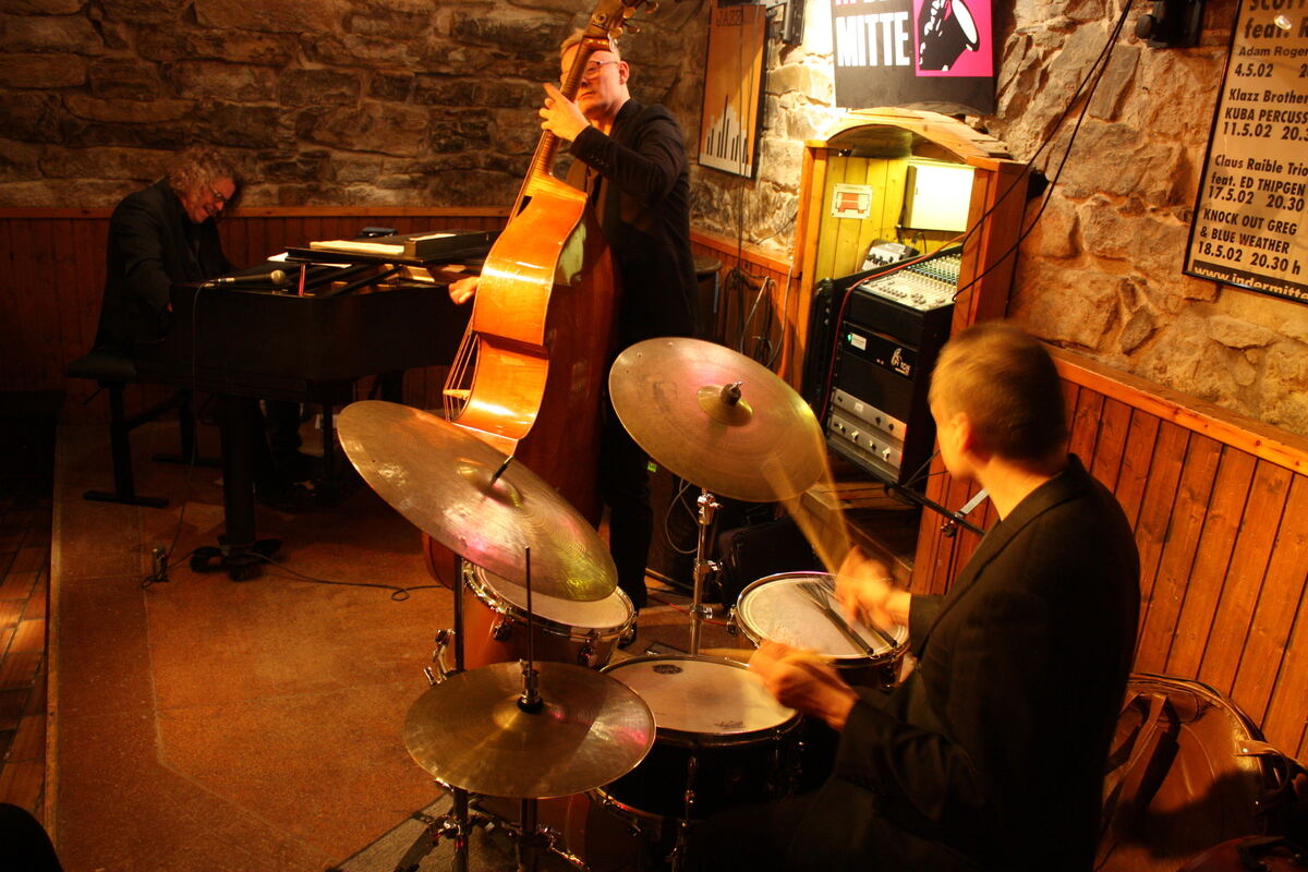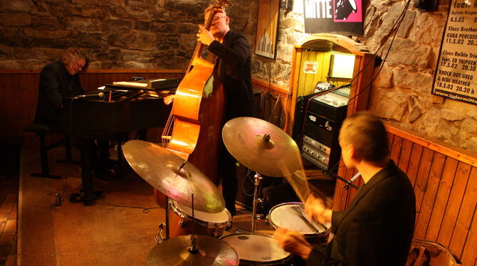 Martin Sasse (Klavier), Markus Schieferdecker (Kontrabass) und Joost van Schaik (Schlagzeug) mussten im Jazzclub in der Mitte ohne den angekündigten Saxofonisten Harry Allen auskommen.
