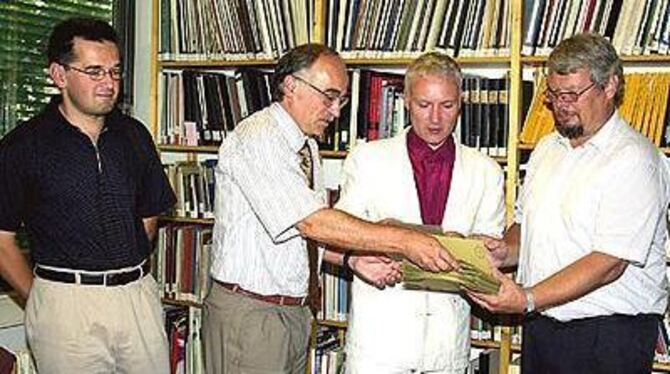 Ludwig Finckhs Enkel Tilman von Kutzleben (rechts) bei der Präsentation der Briefe, Postkarten und Gedichte von Hermann Hesse im Reutlinger Stadtarchiv mit (von rechts) Dr. Markus Raab, Dr. Heinz Alfred Gemeinhardt und Gerald Kronberger.