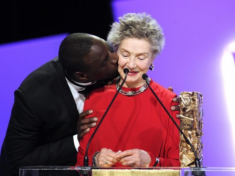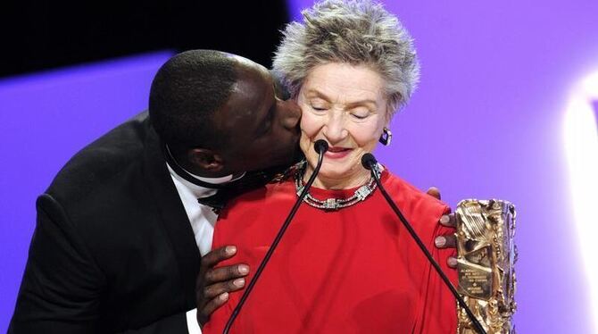 Omar Sy küsst Emmanuelle Riva, die als beste Schauspielerin einen César erhalten hat. Foto: Yoan Valat