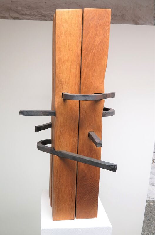 Stele aus Eichenholz und Eisen von Anne Bösenberg in der Galerie im Gewölbe bei Osiander in Reutlingen.