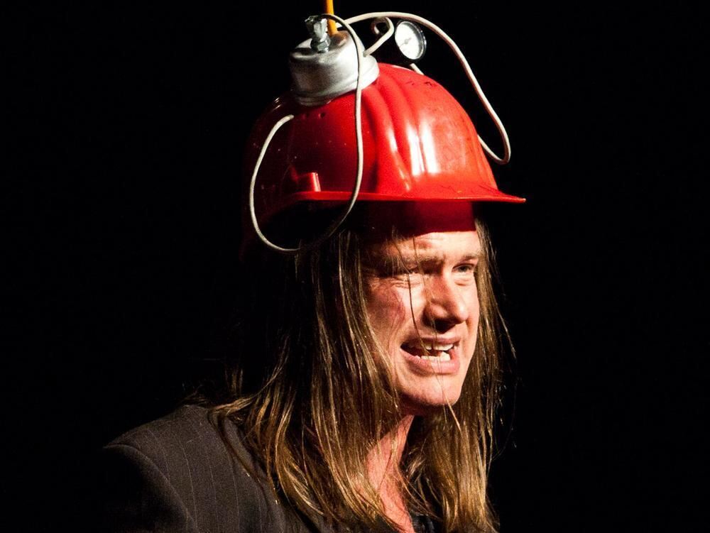 Jan Mixsa im Satire-Programm zum 3. Oktober in der Tonne. Er spielte in einer Nummer einen DDR-Bauarbeiter mit Antennenhelm: Angeblich wusste niemand, dass der Mann bei der Stasi war, obwohl es offensichtlich war und jeder in Wahrheit Bescheid wusste. FOTO: SCHULTZE