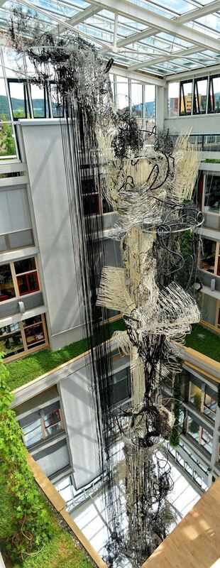 Susanne Kesslers Rauminstallation »Mäander« im Atrium des Dominohauses, die sich in einem Bodenspiegel zu doppelter Größe auswächst. FOTO: MARKUS NIETHAMMER