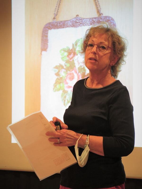 Iris Other und im Hintergrund die Projektion einer Perltasche. FOTO: STRÖHLE