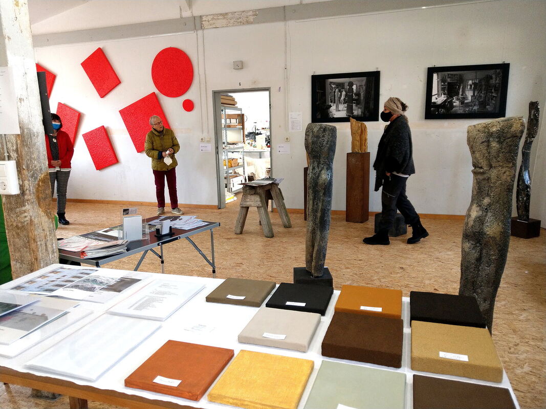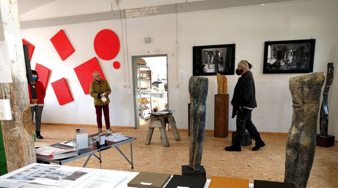Brigitte Tharin (neben der Tür) interviewt im BT24 ihre Künstlerkollegin Elke Roth zu ihren Skulpturen. Im Vordergrund die »Farbproben« von Renate Vetter, links die »Feuer-Bilder« von Renate Quast. FOTO: BÖHM