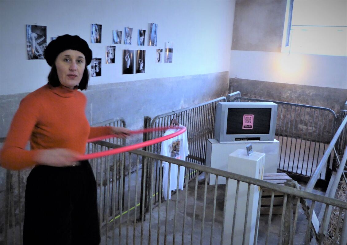 Ausstellung im Schweinekoben: Karin Kontny mit Hula-Hoop-Reifen. FOTO: BERNKLAU
