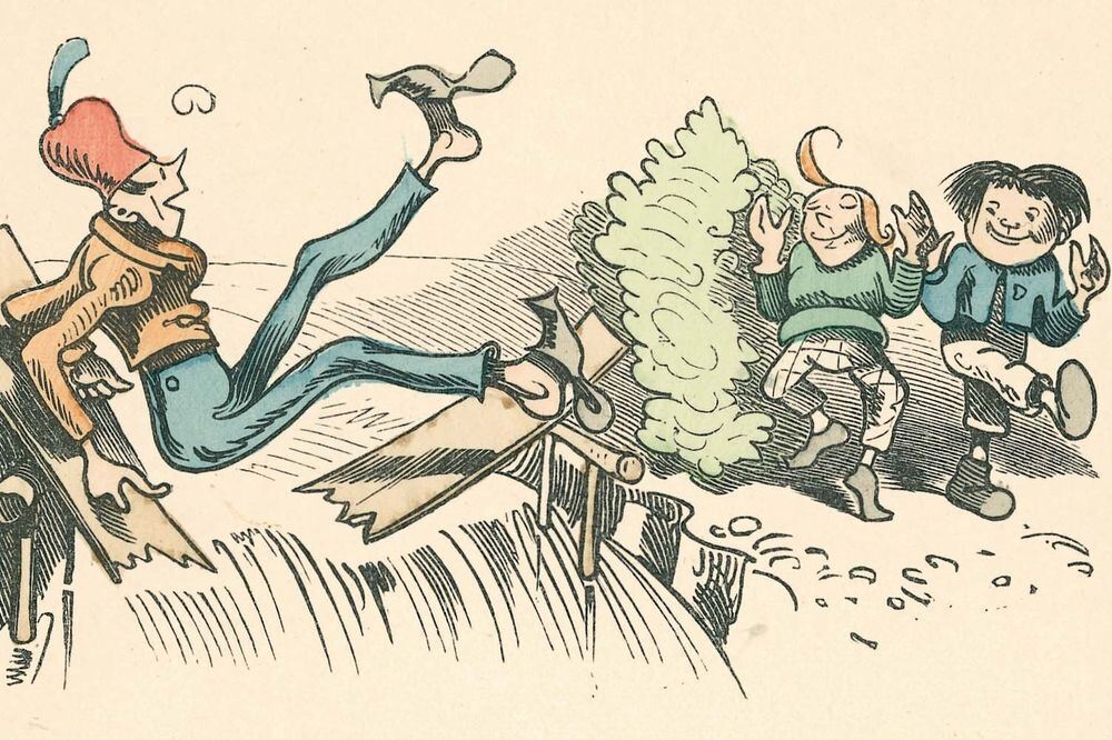 Und schon ist er auf der Brücke, / Kracks! Die Brücke bricht in Stücke; / Wieder tönt es: »Meck, meck, meck!« / Plumps! Da ist der Schneider weg! FOTO: WILHELM BUSCH/WIKIPEDIA