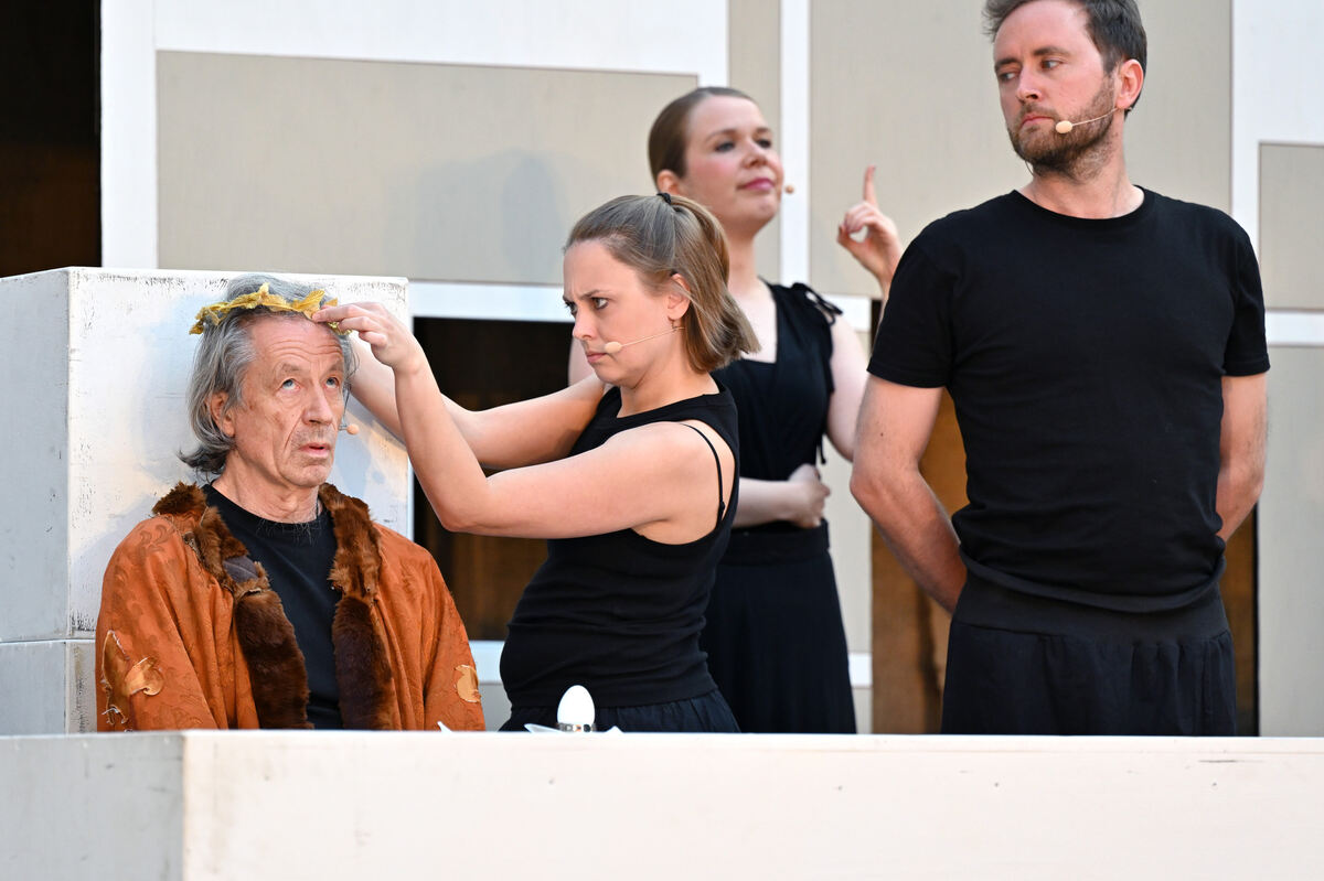 Szene aus »Romulus der Große« mit Rupert Hausner, Kristin Scheinhütte, Jessica Schultheis und David Liske (von links). FOTO: PIETH