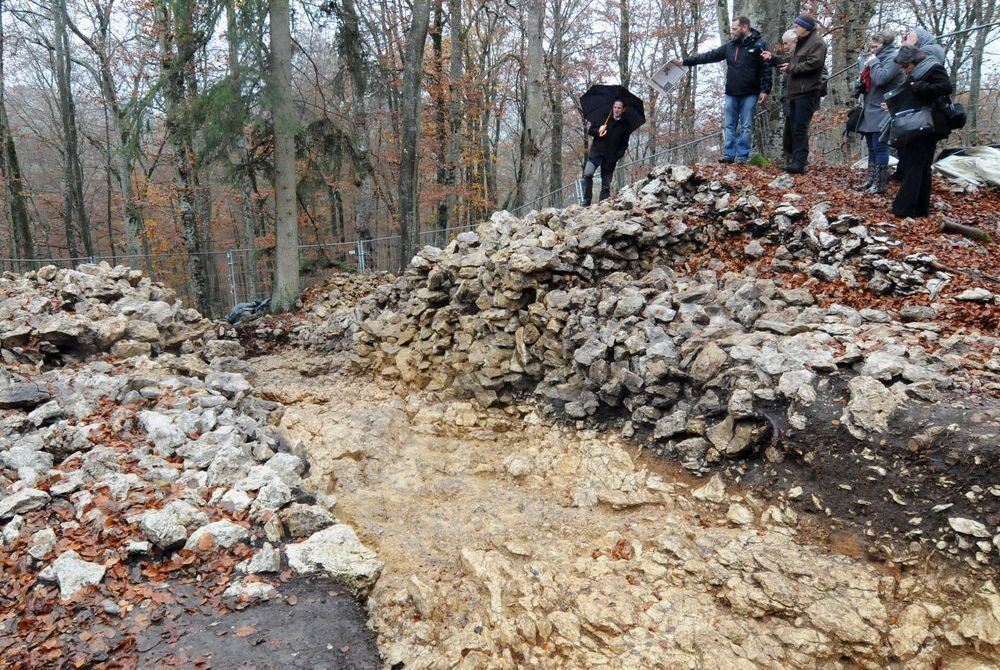 Der Wallhügel der Großen Heuneburg bei Upflamör entpuppte sich bei Grabungen als Stumpf einer imposanten, rund 3,6 Meter breiten Außenmauer, die einst mehrere Meter hoch gewesen sein muss.