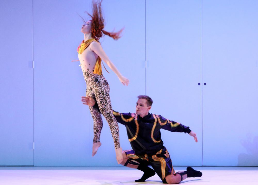 Die Tänzer Evi van Wieren (links) und Johannes Blattner in einer Szene des Balletts »Der Kuss« von Guido Markowitz am Theater Pforzheim. Foto: Haymann