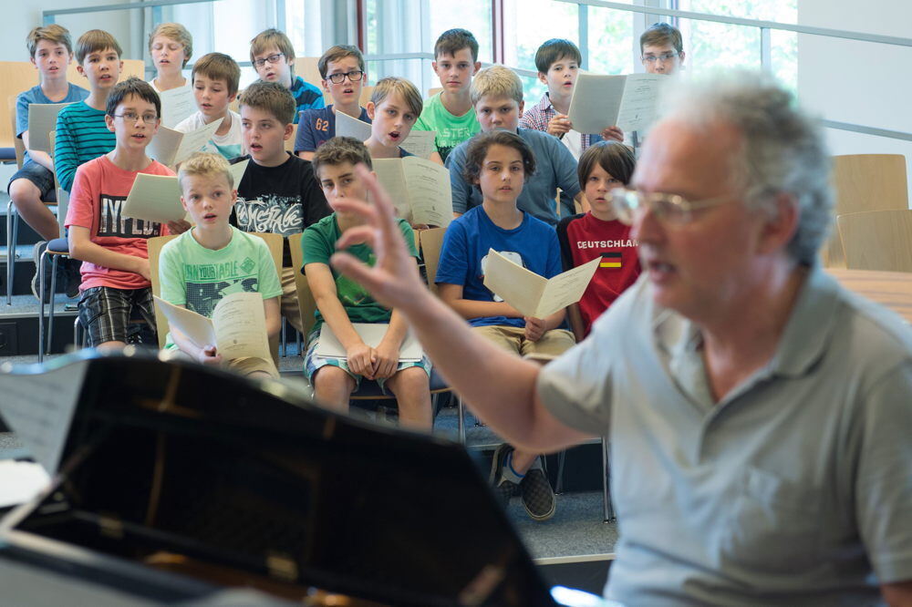 Roderich Kreile, Kantor des Dresdner Kreuzchors, sitzt während einer Probe im Evangelischen Kreuzgymnasium in Dresden (Sachsen) vor den Kruzianern des Dresdner Kreuzchors. Die sächsischen Knabenchöre stehen für Tradition und Innovation. Foto: Sebastian Kahnert/dpa