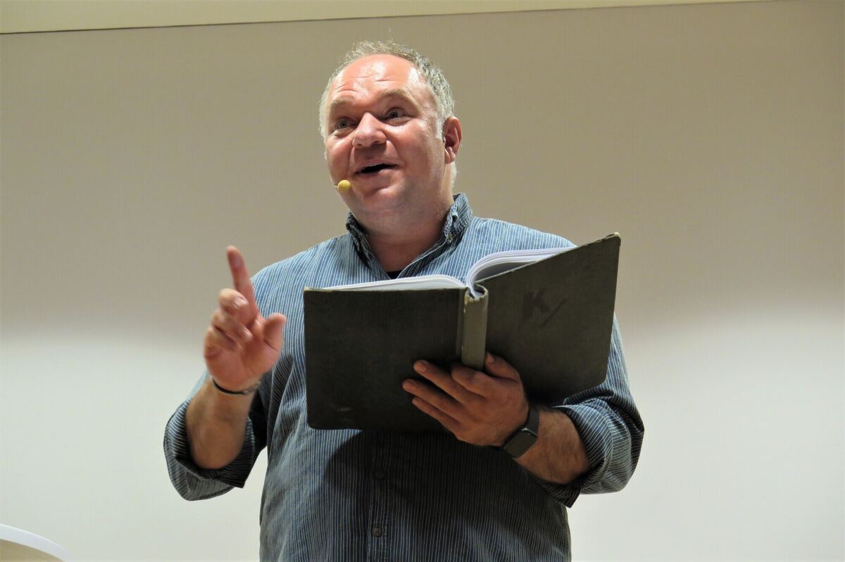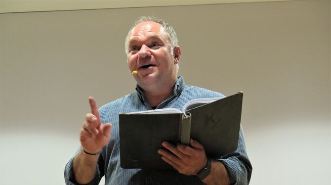 Macht euch mal locker! Diesen Tipp gibt Comedian Serhat Dogan seinem überwiegend deutschen Publikum in der Reutlinger Volkshochschule. FOTO: STEINRÜCKEN