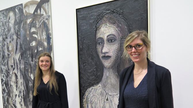 Anna Nerobova (links) und Ina Dinter haben die Ausstellung im Reutlinger Spendhaus kuratiert. Hier sind sie vor Strawaldes Gemälden »Prophetin« (1992, links) und »Bildnis« (1993/2001) zu sehen. FOTO: STRÖHLE