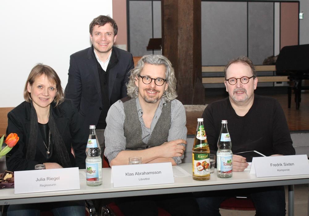 Beteiligte an der Wallander-Oper beim Pressegespräch in Tübingen: Regisseurin Julia Riegel (von links), der Initiator und künstlerische Leiter des Projekts, Philipp Amelung, Librettist Klas Abrahamsson und Komponist Fredrik Sixten.