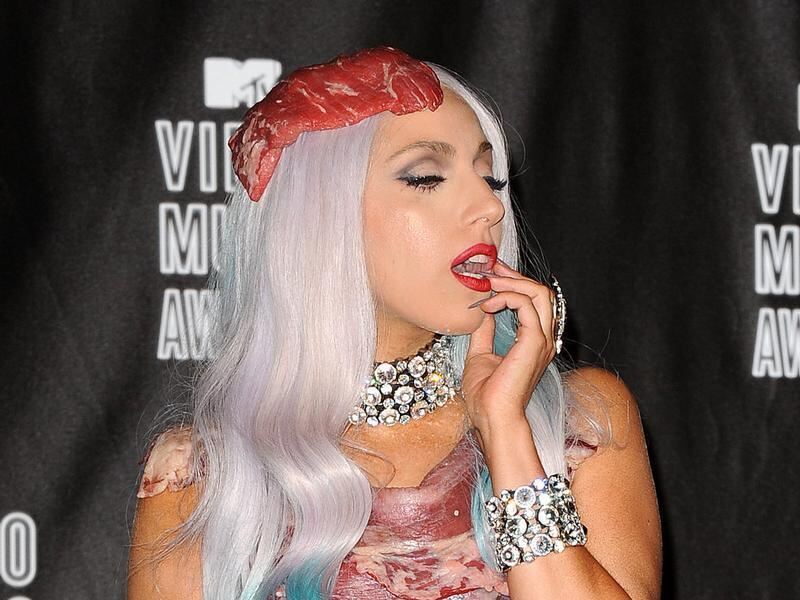 Immer für eine Überraschung gut: Lady Gaga mit einem Fleischstück auf dem Kopf.