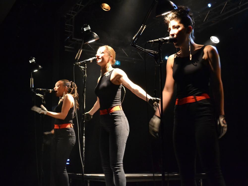 Schreibtischlampen an Mikrofonständern beleuchten die Frauenband Laing im franz.K.