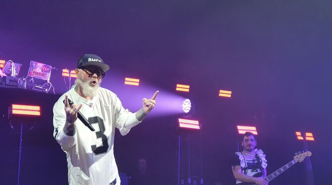 Auf »Still Sucks«-Tour: Limp Bizkit in der Stuttgarter Schleyerhalle. Frontmann Fred Durst mit Mikrofon in gewohnt cooler Haltung. FOTO: SCHITZ
