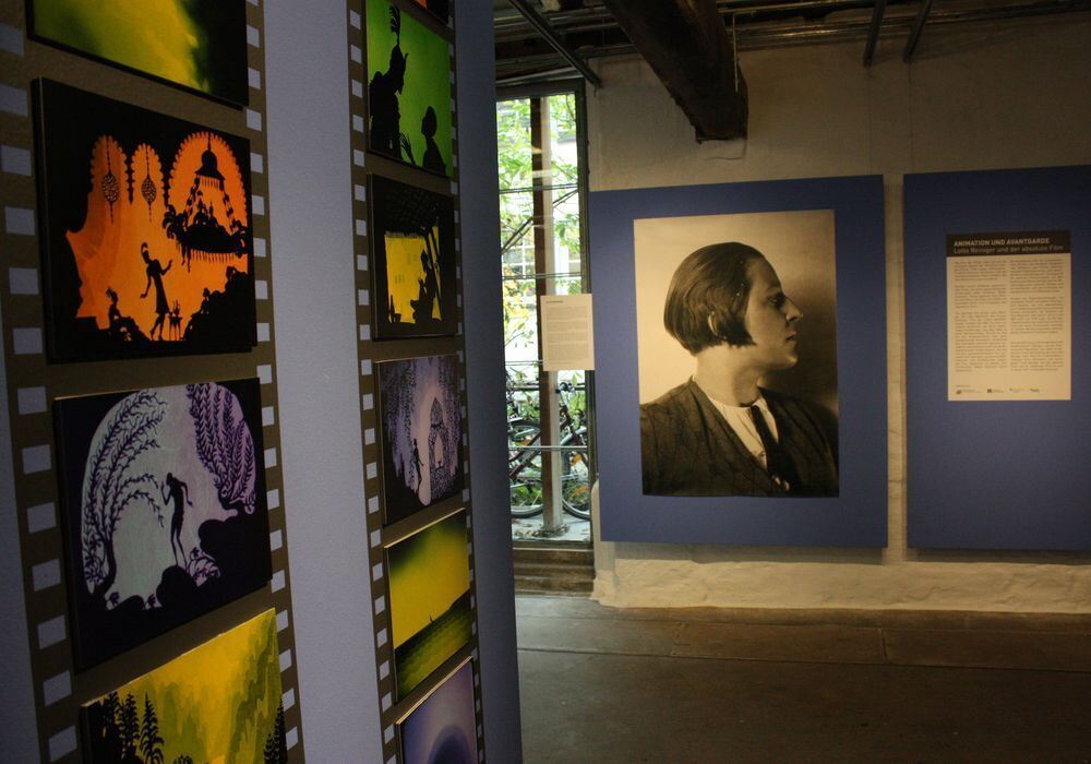 Ein Porträt von Lotte Reiniger und Filmstills (links) aus ihrem Silhouettenfilm »Die Abenteuer des Prinzen Achmed«.