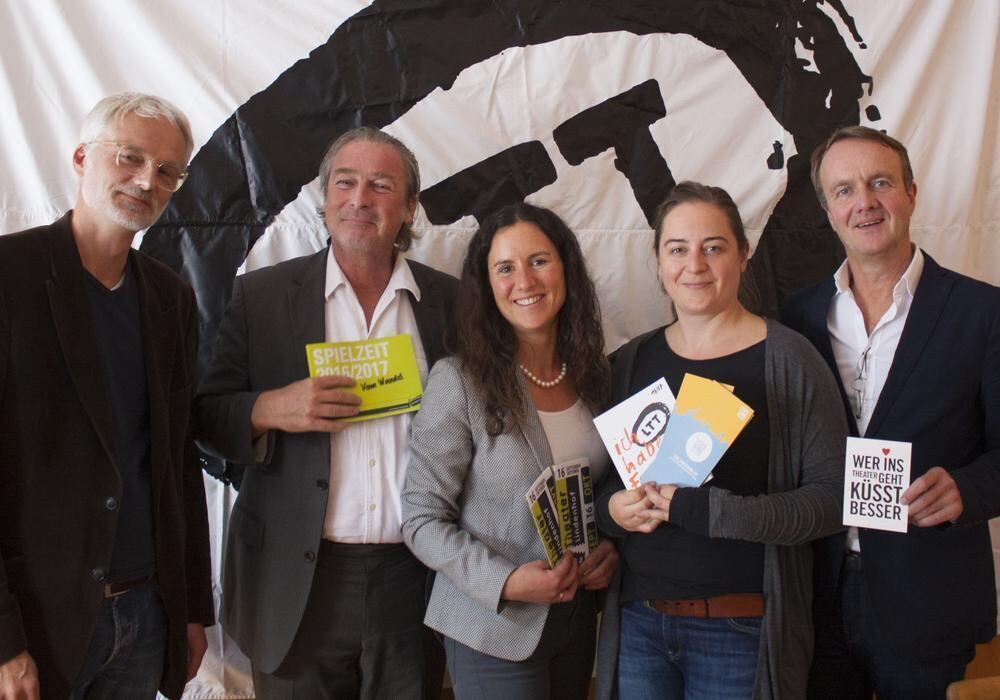 RAFO-Projektpartner: Christian Burmeister-van Dülmen (von links) und Stefan Hallmayer vom Theater Lindenhof, Judith Bildhauer von der Kulturregion Schwäbische Alb, Kerstin Grübmeyer und Thorsten Weckherlin vom LTT. FOTO: PR