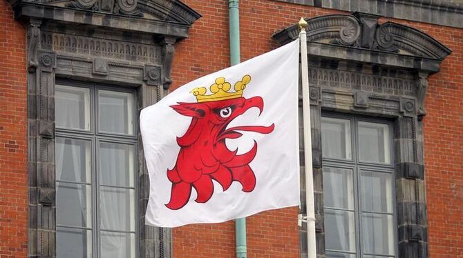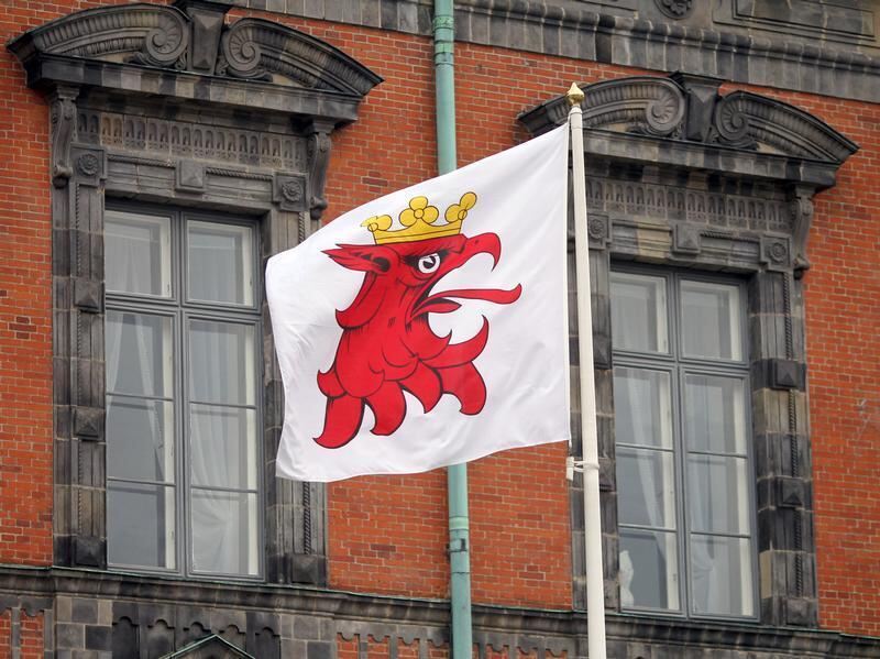 Flagge mit dem Wappen von Malmö weht vor dem Rathaus der südschwedischen Stadt. Foto: Jens Wolf