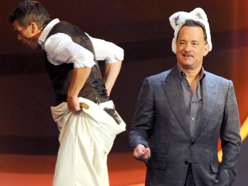 Tiefpunkt: Markus Lanz beim Sackhüpfen, beobachtet vom absurd kostümierten Tom Hanks. Foto: Ingo Wagner/Archiv