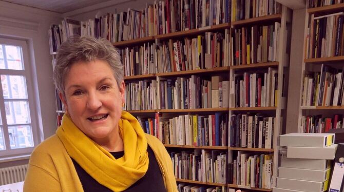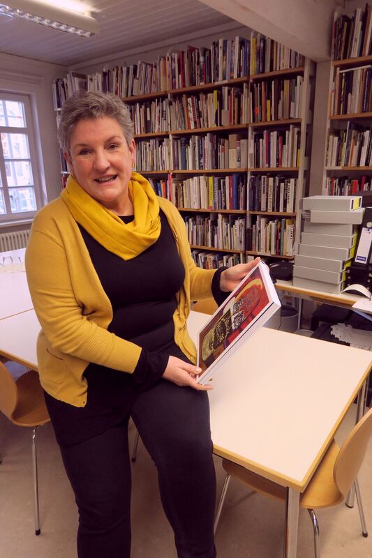 Köser-Rudolph in der von ihr eingerichteten Bibliothek im »Landjägerhaus«, wo die Verwaltung des Museums untergebracht ist, mit dem Katalog zu Damien Deroubaix. FOTO: KNAUER
