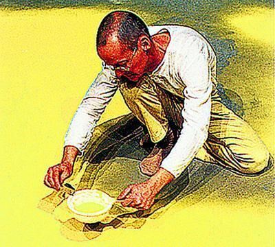 Wolfgang Laib bestreut für eine Installation eine Fläche mit Haselnusspollen.