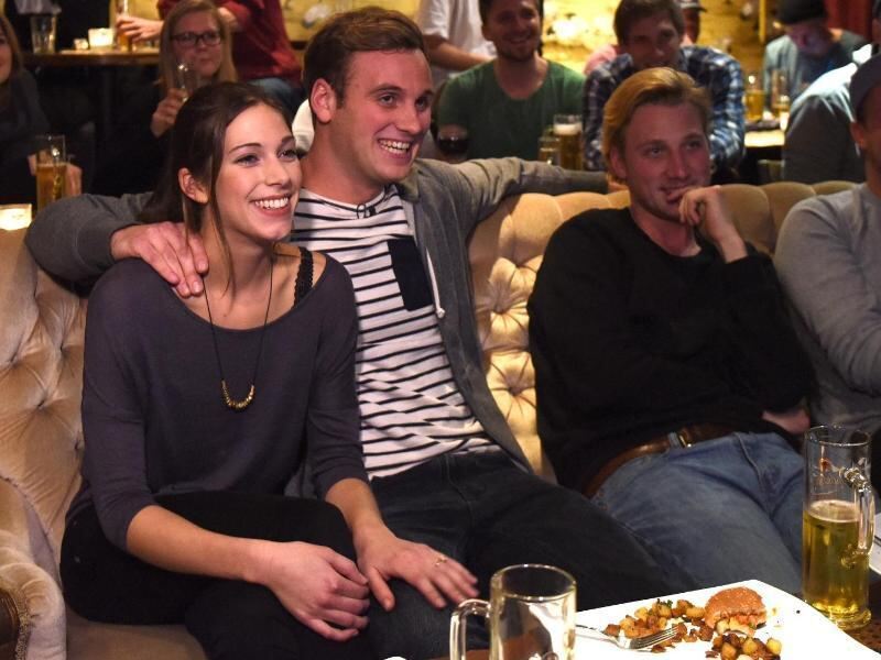 Jauch-Millionär: Leon Windscheid (M.) freut sich zusammen mit seiner Freundin (l.) und Freunden in einer Münsteraner Kneipe. Foto: Caroline Seidel