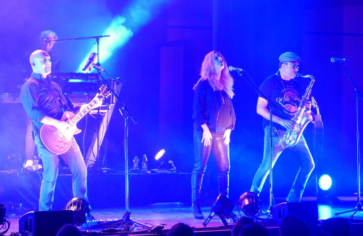 Die Echoes – von links Leadgitarrist Oliver Hartmann, Keyboarder Paul Ahrens, Sängerin Ilka Müller und Saxofonist Michael Unger – in der Reutlinger Stadthalle. FOTO: MORAWITZKY
