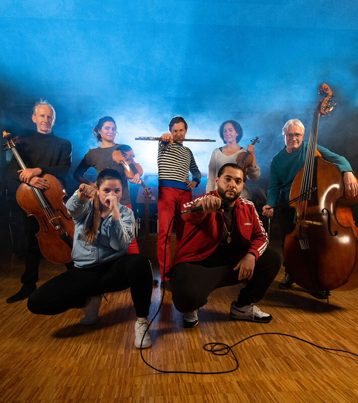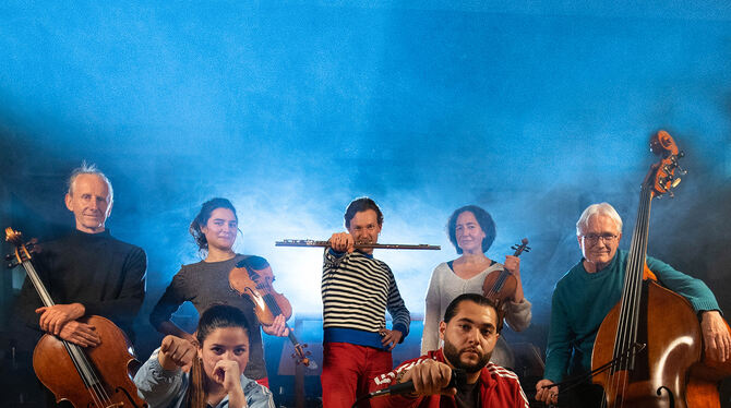 Stehen stellvertretend für die Zusammenarbeit: Fried Dähn, Sena Umul, Peter Eberl, Virginie Wong und Günter Fischer (hinten, von links) von der Württembergischen Philharmonie und Lisa Berkani und Darwan Serin (vorn) vom TALK-Projekt.