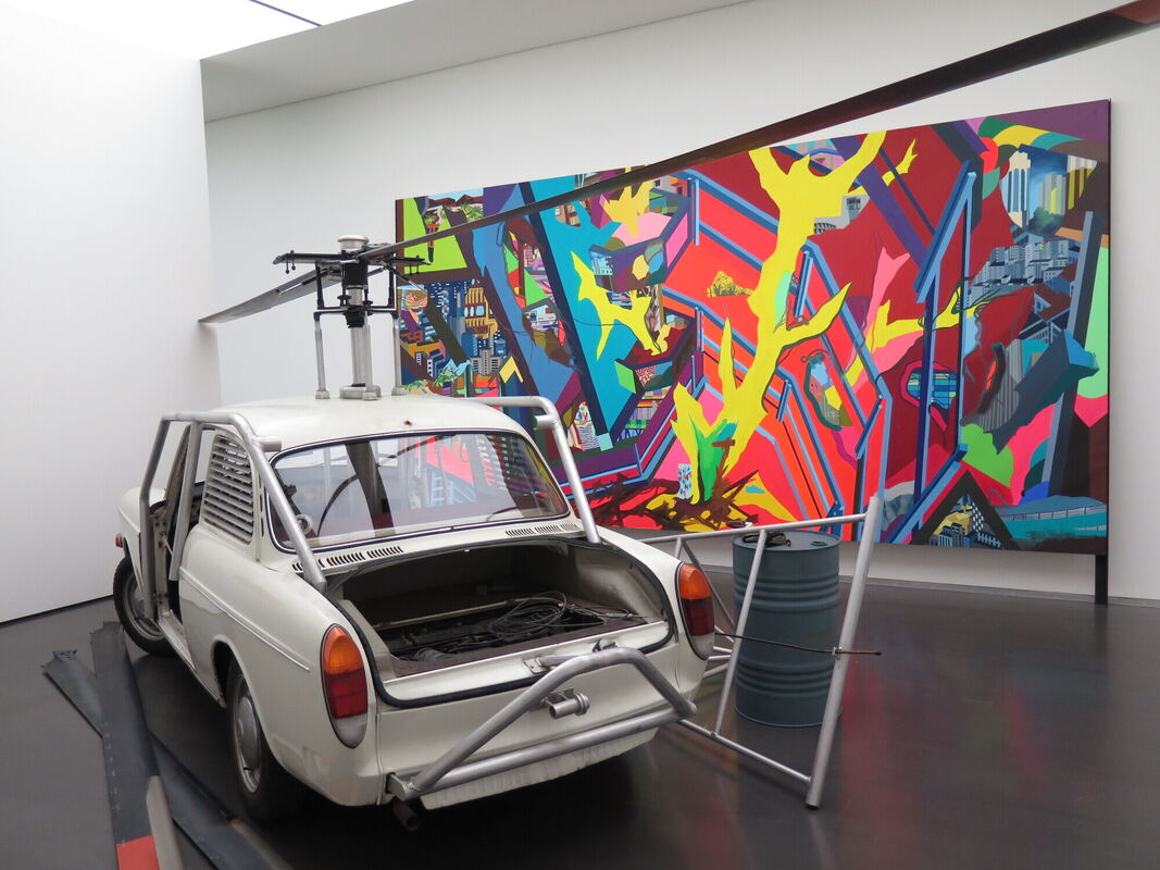 Franz Ackermanns »Helikopter Nr. 21 (Flucht- und Befreiungsfahrzeug)« (2003/2018) und dahinter sein Ölgemälde »Kaufhausbrand« (2018). Beide Werke nehmen Bezug auf die RAF.