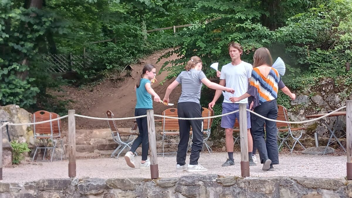 Fiona, Luna, Hannah und Marie üben mit dem Chorografen Hannes Langanky für die Aufführung von »Carmina Burana«. In die Rolle des Schwans wird in den Aufführungen der Tenor Christian Wilms schlüpfen.